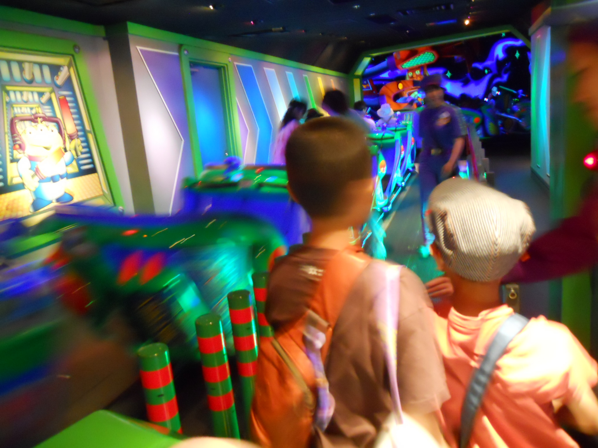 ただし、FPでも10分くらいは並んだかなあ。それでも、建物内に入ってしまえば、すでにストーリーは始まっており、子供たちも楽しい。カートは3人乗り。兄貴二人組と、娘とハハ組に分かれました。