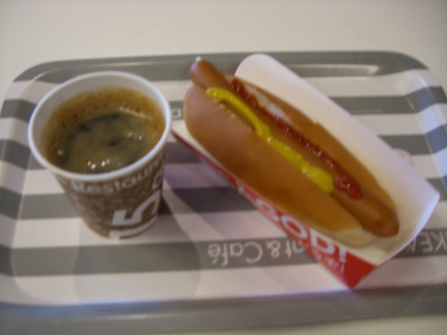 順路でいくと、2Fのレストランに先に出会うのですが、最後の最後でレジをでたとこにスナックスペースがありました。メインメニューはホットドッグとドリンクバー。