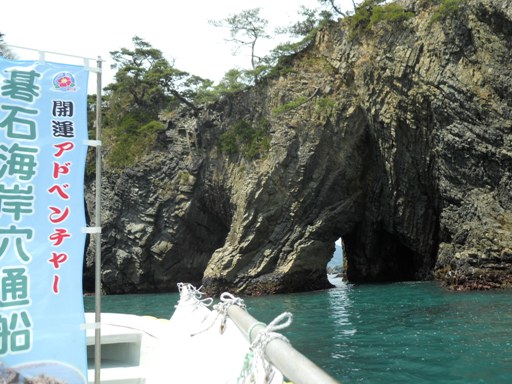 「穴通磯」の穴をゆっくりボートですりぬけます。もう、子供じゃなくても超楽しい!!