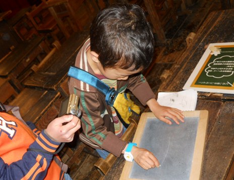昔の木の机や、石板なんかが触れる展示になっている・・・・ところが子供たちのツボ。