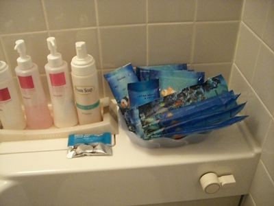 普通のユニットなんだけど、シャンプーセットのほかに化粧水とかメイク落としなんかもボトルで。